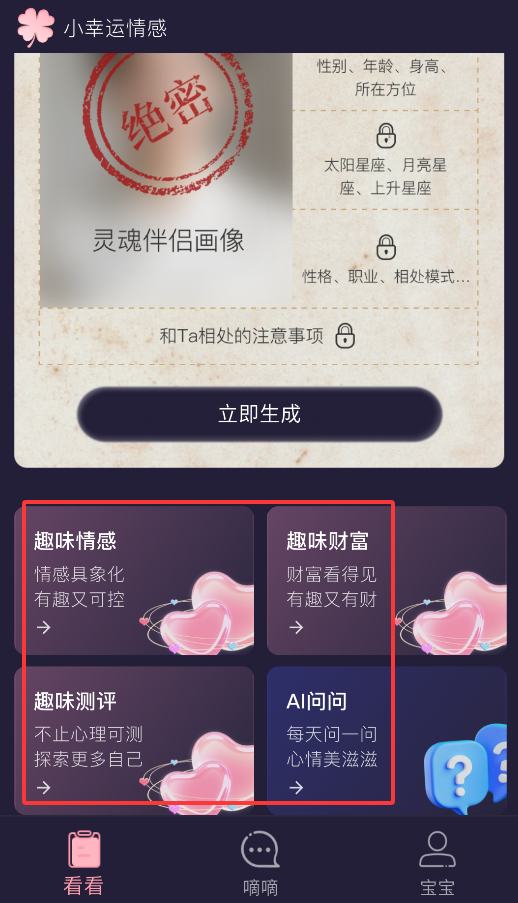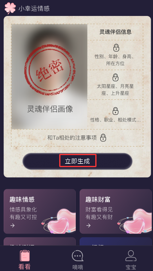 小幸运APP帮你找对象和了解自己。按你喜欢的类型输入信息,马上就能生成一个理想中的伴侣,找朋友更方便。有啥要求都能快速搜到,结果直接显示。这里还有婚恋建议、心理测试和财运分析这些内容,你想看的都能找到。测一测心理状态,也能让你更认识自己,放松心情,好好过日子。