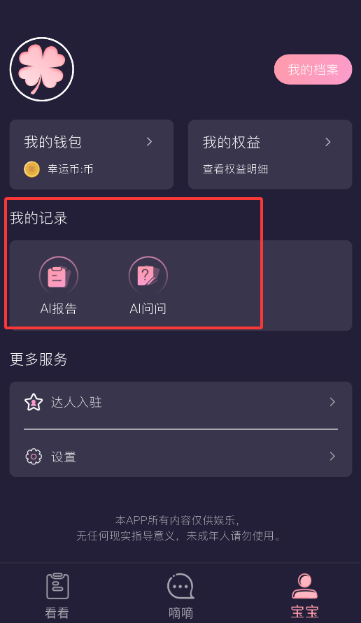 4、个人中心集中管理AI分析报告、问答记录、虚拟币余额及会员权益状态。