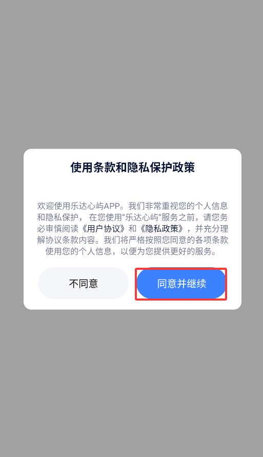 1、首次启动乐达心屿APP时会显示用户协议,点击"同意"按钮后即可进入心理健康服务平台。