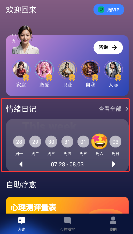 2、"情绪日记"功能位于咨询专区,支持记录每日心情变化、情绪波动及触发事件等内容。