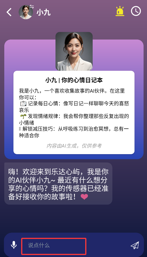 3、AI心理伙伴"小九"提供7×24小时陪伴服务,可进行压力倾诉、情绪疏导等对话交流。