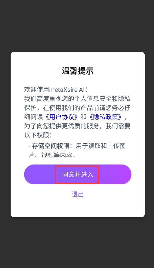 1、首次启动APP会显示用户协议,点击"同意"按钮后即可进入AI互动控制平台。