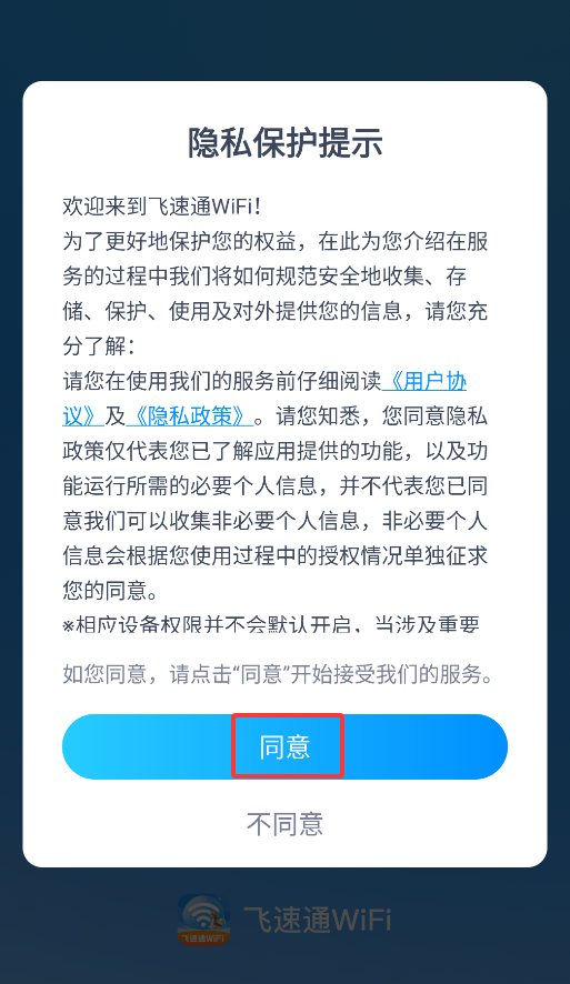 1、首次启动飞速通WiFi时,系统会弹出用户协议确认窗口,点击"同意"按钮后方可进入应用主界面。