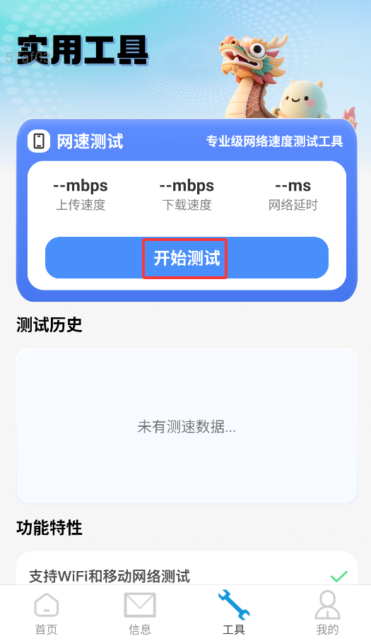 4、工具箱内置网速测试功能,点击"开始测试"即可实时检测下载、上传速率及网络延迟。