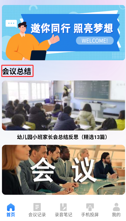 2、首页集中展示会议纪要内容,支持快速查看近期会议记录和重点摘要。