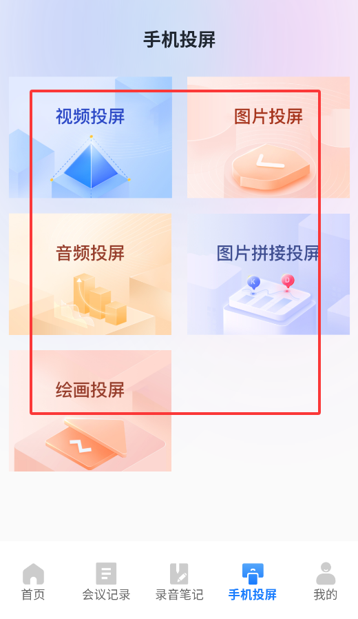 4、投屏中心支持多种媒体投屏方式,包括视频、图片、音频、拼图和手绘内容投屏。