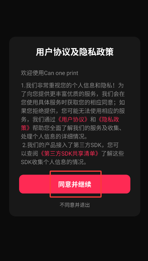 1、首次启动Can one print APP时,系统会弹出用户协议确认窗口,点击"同意"按钮后方可进入应用主界面。