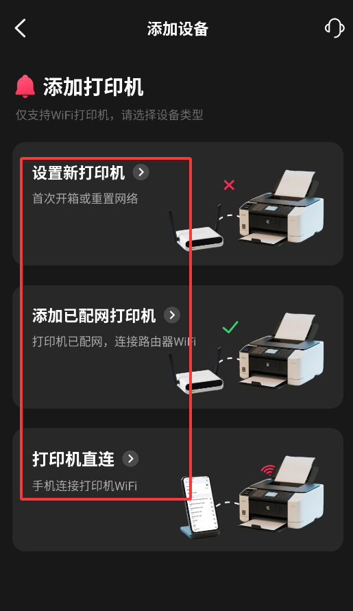 4、打印机添加界面支持三种连接方式:新设备设置、已联网打印机添加和直接连接打印机配置。