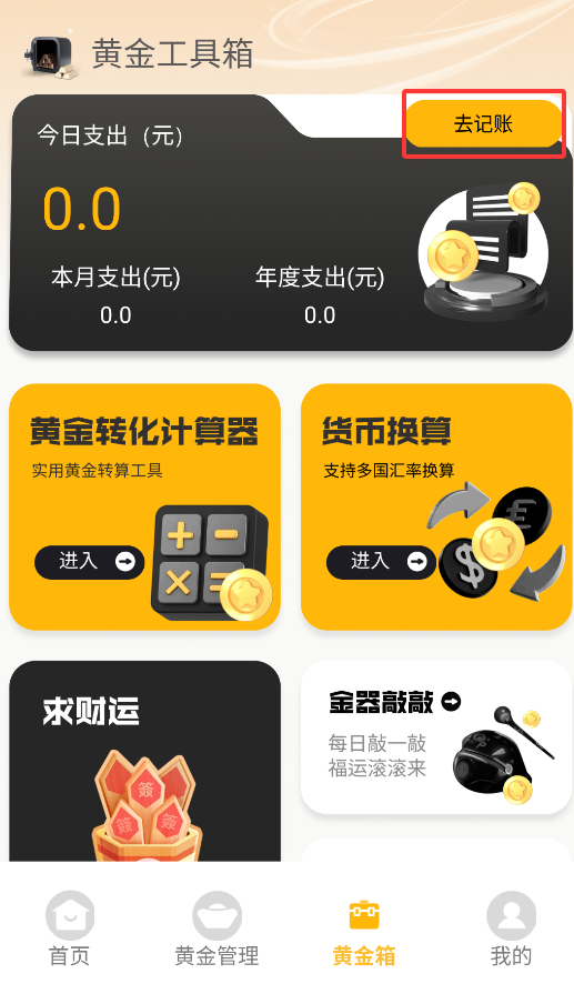 3、点击"黄金账本"功能,即可开始记录每日黄金相关的收支明细。