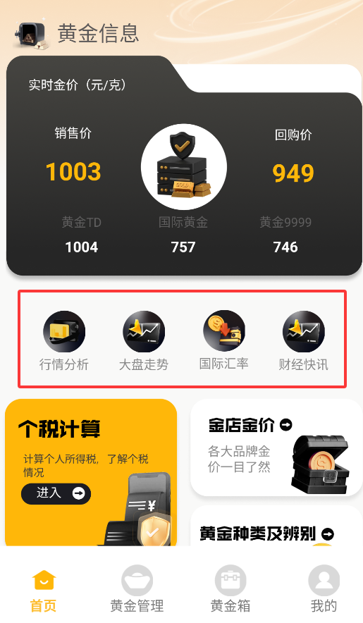 1、打开APP后,首页实时展示黄金价格走势图、国际汇率动态和最新财经资讯,帮助把握投资时机。