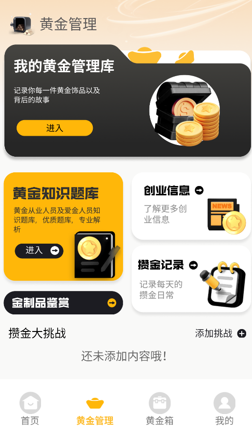 2、进入"黄金资产管理"页面,可查看个人黄金持仓情况,同时提供黄金投资知识库、创业金点子及储蓄记录功能。