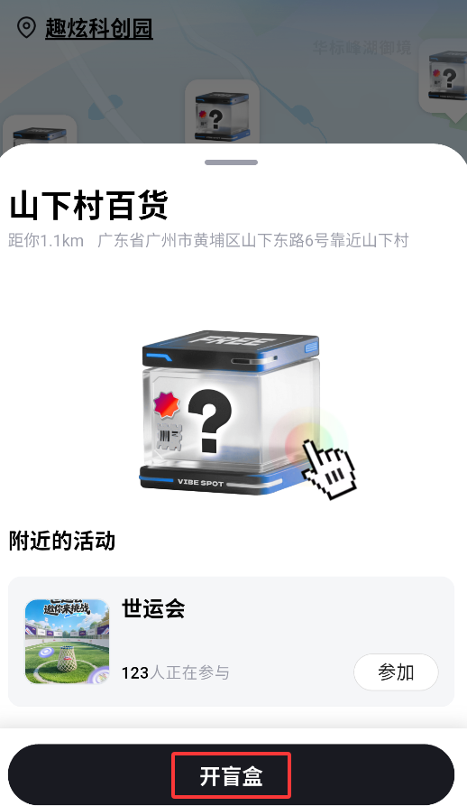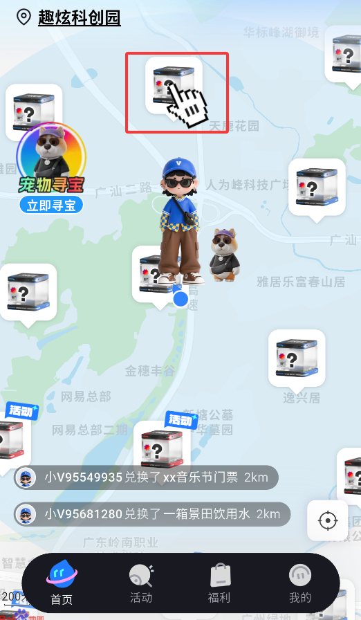 2、主界面以地图形式展示周边分布的虚拟宝盒,不同颜色代表不同类型的惊喜奖励。