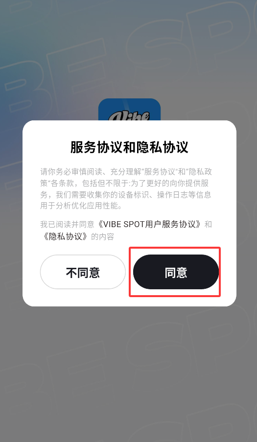 1、首次启动Vibe Spot应用时,系统会弹出用户协议,点击"同意"后方可进入主界面开始探索。