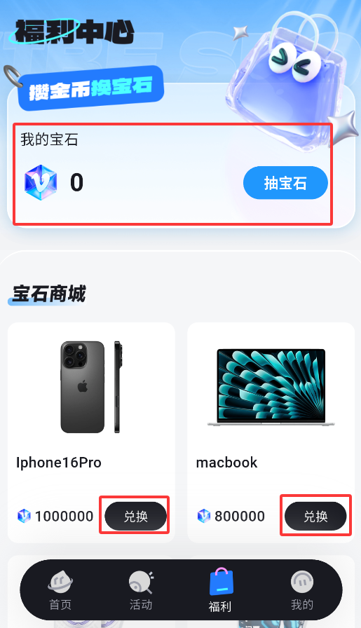 4、"我的福利"页面显示累计获得的宝石数量,并可在宝石商城兑换各类实物礼品和专属特权。