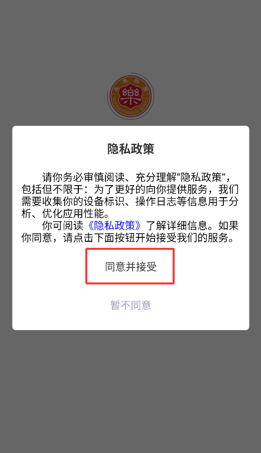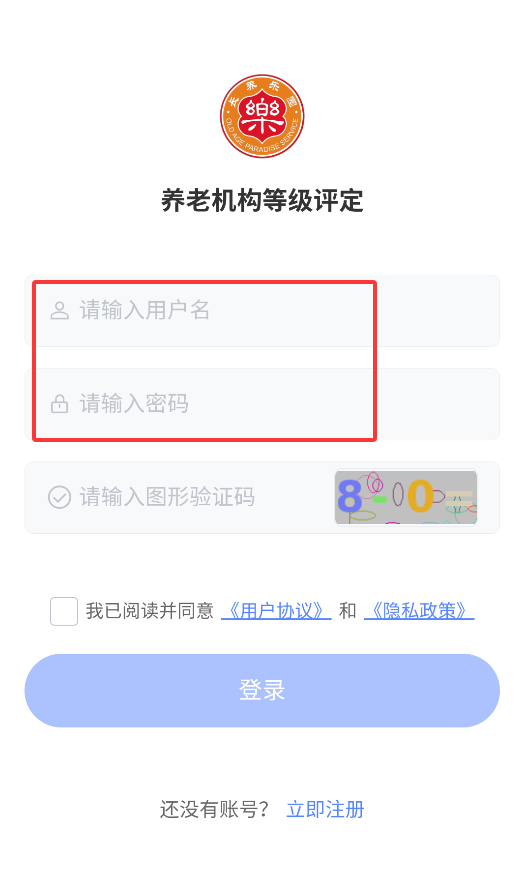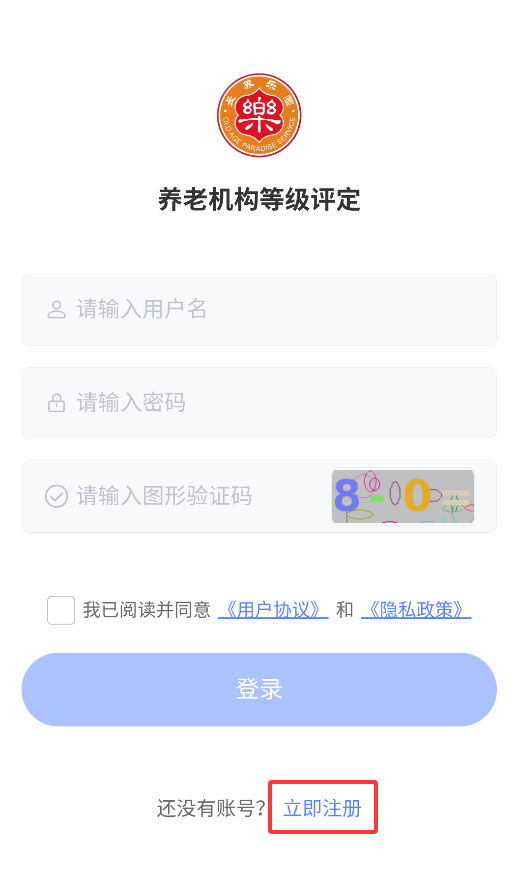 1、首次启动APP会显示用户协议弹窗,点击"同意"按钮后进入养老机构服务平台登录页面。