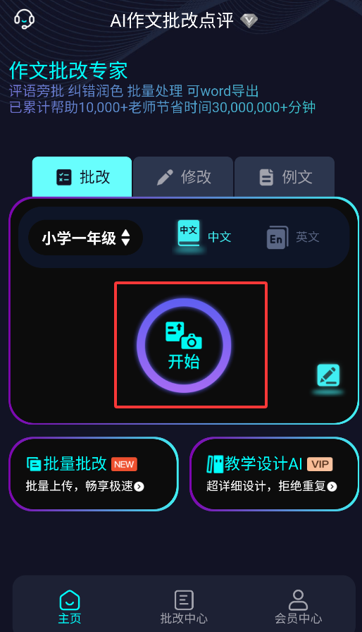 2、首页提供三大核心功能:作文批改、智能修改和范文参考,点击对应按钮即可开始使用。