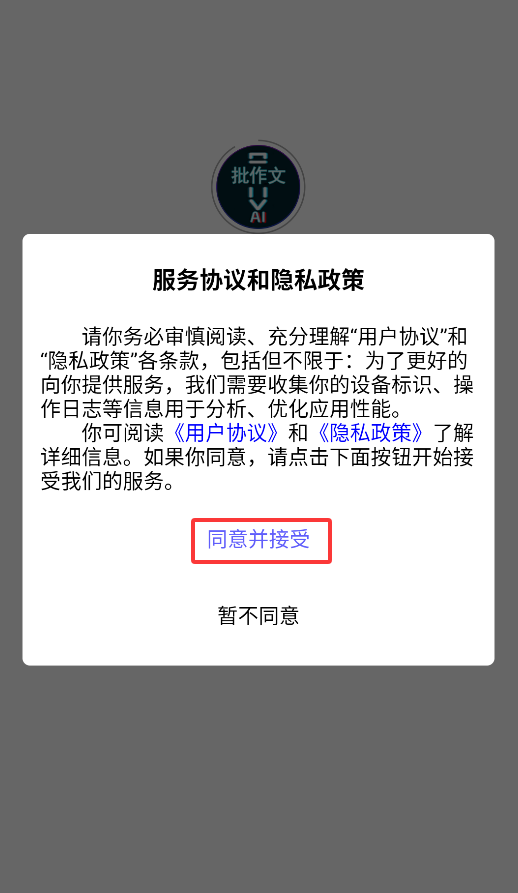 1、首次启动APP会弹出用户协议,点击"同意"后即可进入智能批改系统主界面。