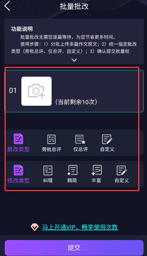 4、批量处理功能允许拍照上传多篇作文,可选择旁注批改、总体评价及纠错/精简/扩写等修改模式。