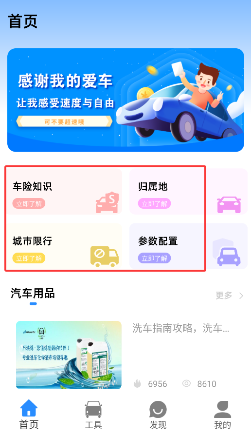 2、首页提供多项实用功能,包括车险知识查询、车辆归属地识别、城市限行提醒及车型参数配置对比。