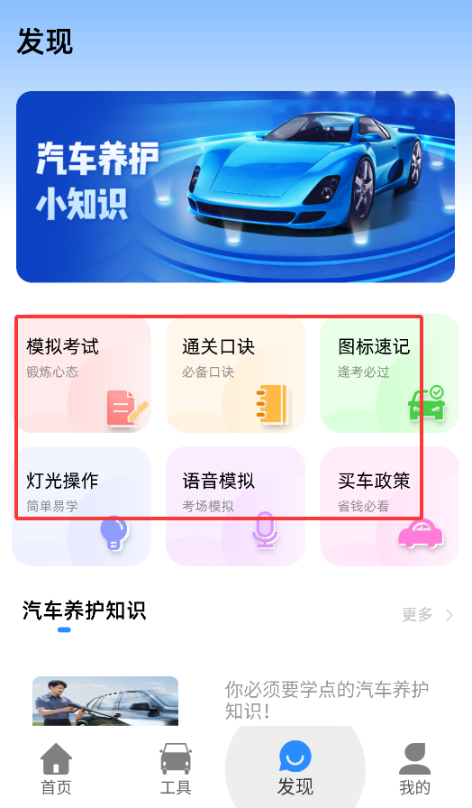 4、发现页整合驾考辅助工具,如模拟考试、灯光操作口诀、交通图标速记及买车政策解读,帮助用户提升驾驶技能。