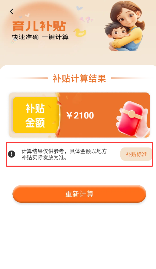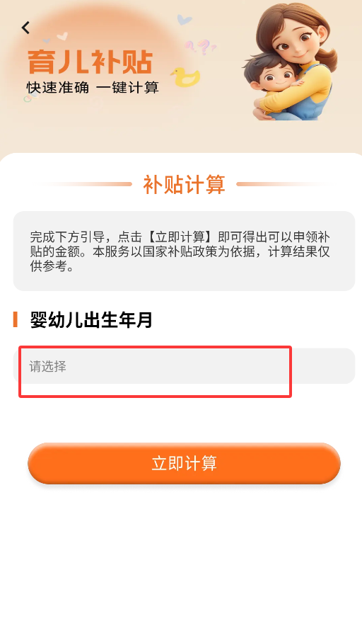 3、在计算界面,选择宝宝的出生年月日,确认无误后点击"立即计算"按钮,系统将自动核算补贴金额。