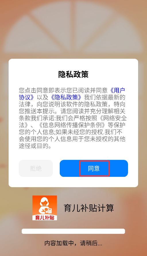 1、首次启动育儿补贴计算器APP时,系统会弹出用户协议窗口,点击"同意"按钮后即可进入主界面。