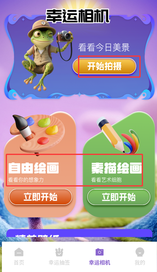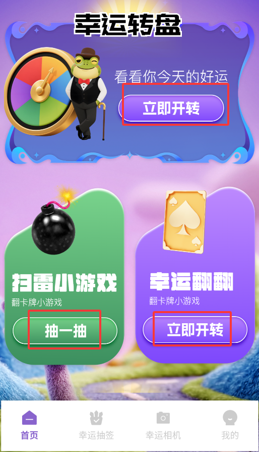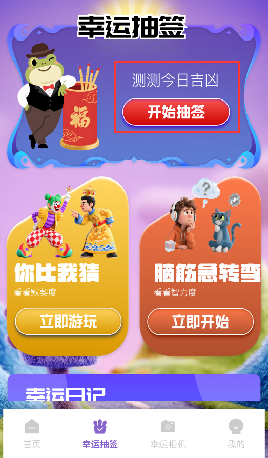 幸运蛙这个APP太好玩了!能抽签算运势,无聊时拍个幸运照,还有扫雷、猜谜各种小游戏打发时间。最有趣的是里面超多脑筋急转弯,边玩边动脑。喜欢画画的也能随手涂鸦。闲着没事打开它,保准让你玩得停不下来,快去下载试试吧。