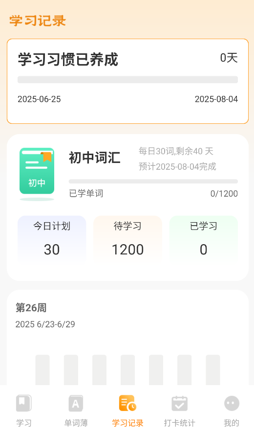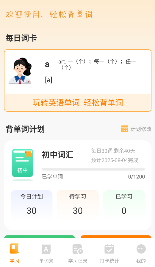 1、打开应用后,首页会智能推送"每日一词"精选词卡,同时支持自定义学习计划(如每日20词/考研核心词等)。