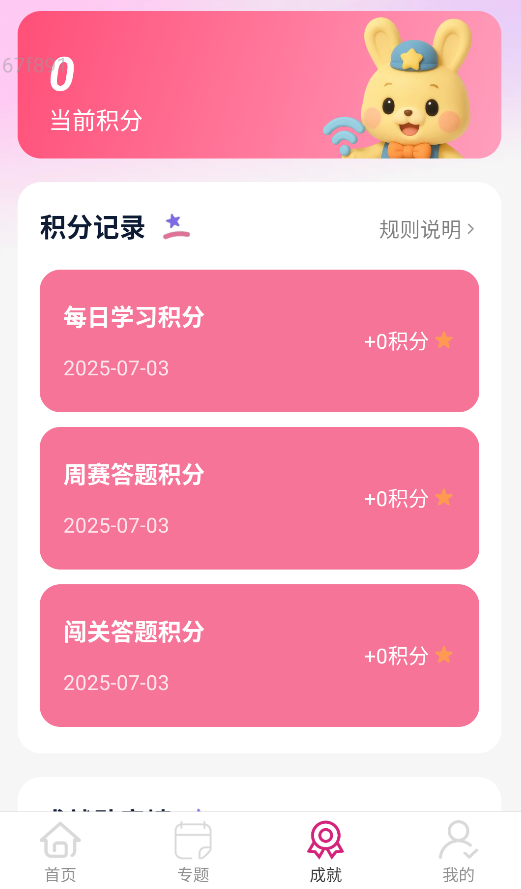 3、进入个人成就中心,不仅能实时查询当前累计积分,还可查看详细积分获取记录和已解锁的荣誉勋章。