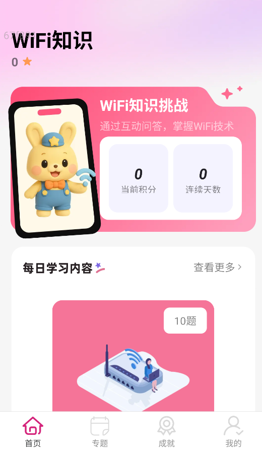 1、启动应用后进入首页,系统会推送每日更新的WiFi基础知识学习内容,用户可随时参与互动问答巩固知识点。