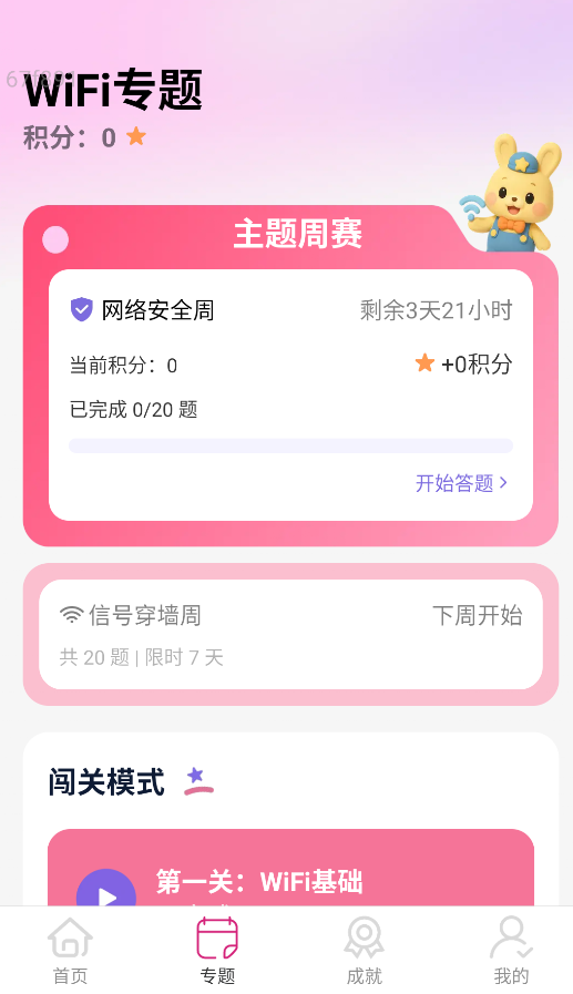 2、切换至专题板块,可浏览精选WiFi技术专题,参与限时主题周赛挑战,还能选择不同难度等级的闯关模式进行趣味答题。