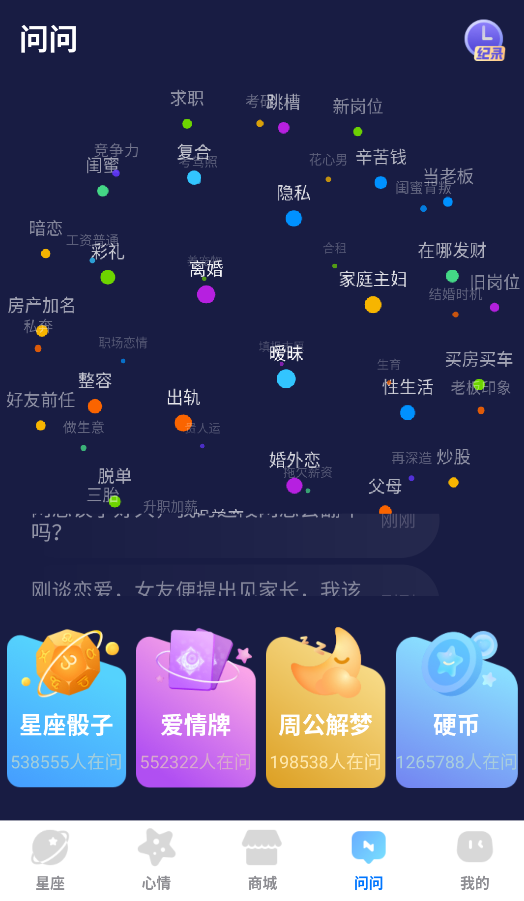 3、"问问"通道可输入具体问题(如"能否复合"),系统会结合当前行星相位生成占卜报告,支持追问深化分析。