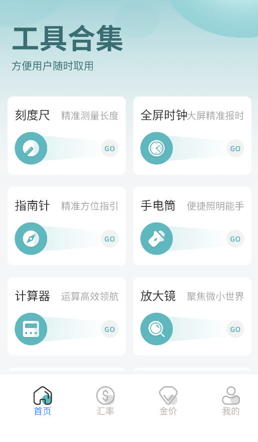 1、启动APP后,首页集成多种实用工具,包括测量尺、全屏时钟、方向定位等日常功能。