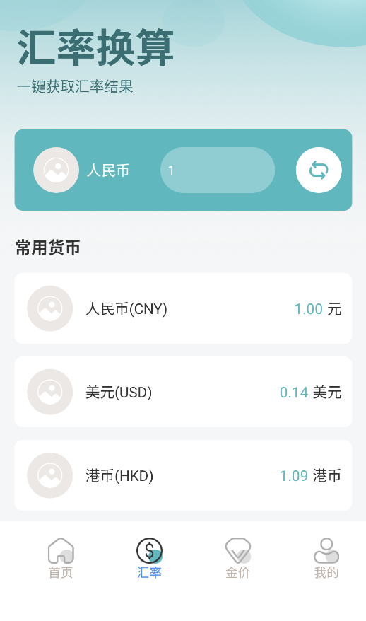 2、汇率换算操作:选定基准货币和目标货币,输入金额后自动计算结果,长按可保存常用货币组合。