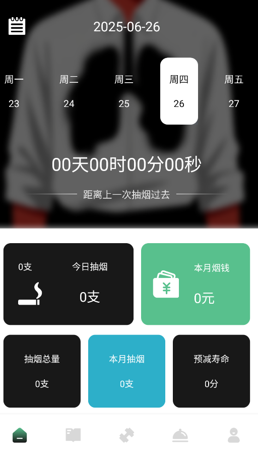 1、打开应用后,首页直观展示当日吸烟量、月度消费统计及累计健康影响数据(如寿命缩减天数),帮助用户量化吸烟成本。