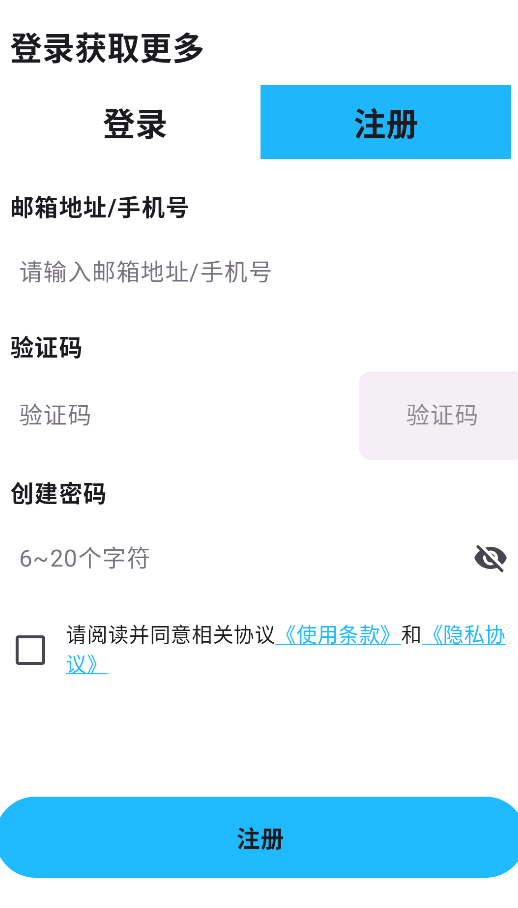 2、填写有效的手机号码或邮箱地址,获取并输入验证码,设置安全密码后点击"立即注册"完成账户开通。