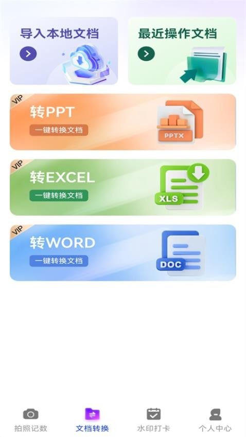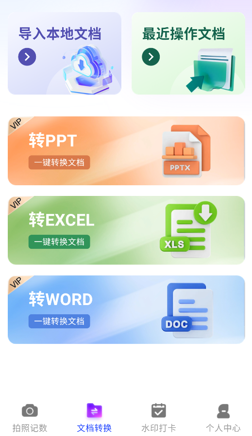 2、进入文档处理中心,可导入手机本地文件或查看最近操作记录,支持将文档转换为PPT、Excel等多种格式。