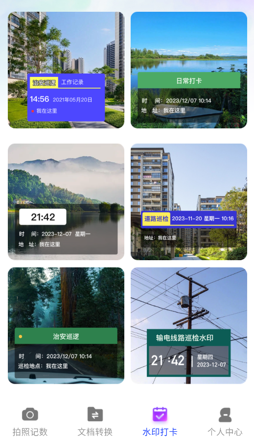 2、多样化水印库:内置100+精美水印模板,涵盖时间、地点、天气等多种类型,满足不同场景的打卡需求。