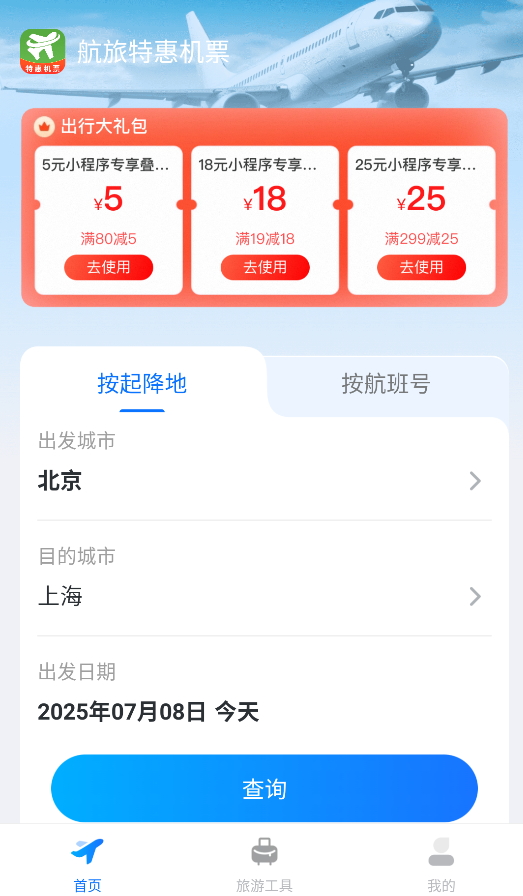 1、进入应用后,在首页输入您的行程信息或直接搜索航班号,系统将展示实时特惠机票。