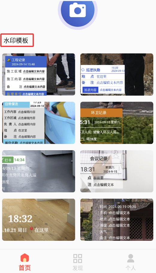 2、进入"水印库"可挑选多种风格模板(时间、地点、天气等),支持自定义文字和排版。