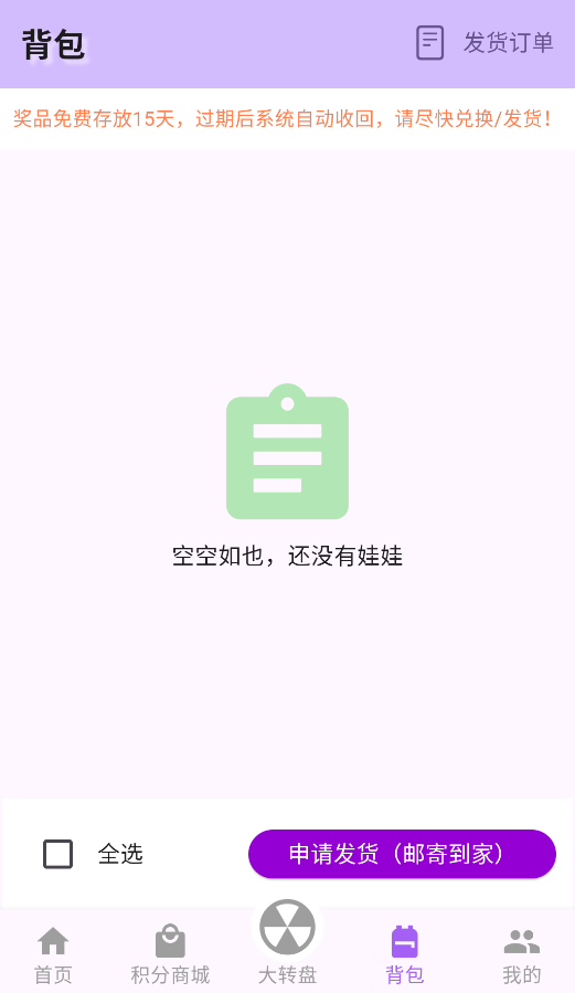 3、个人背包用于管理已获得的娃娃,若超过15天未处理,系统将自动回收,请及时兑换发货。