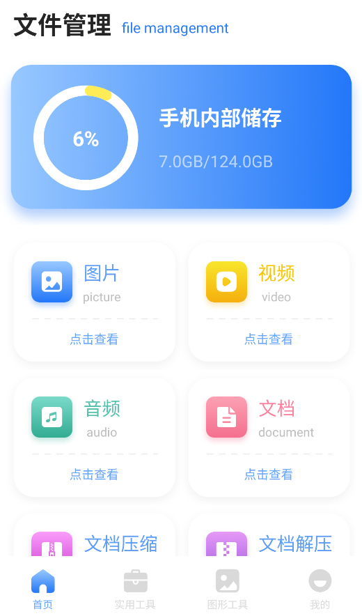 1、打开应用后,首页直观展示手机存储空间使用情况,支持按图片、视频、文档等分类浏览文件,快速管理内容。