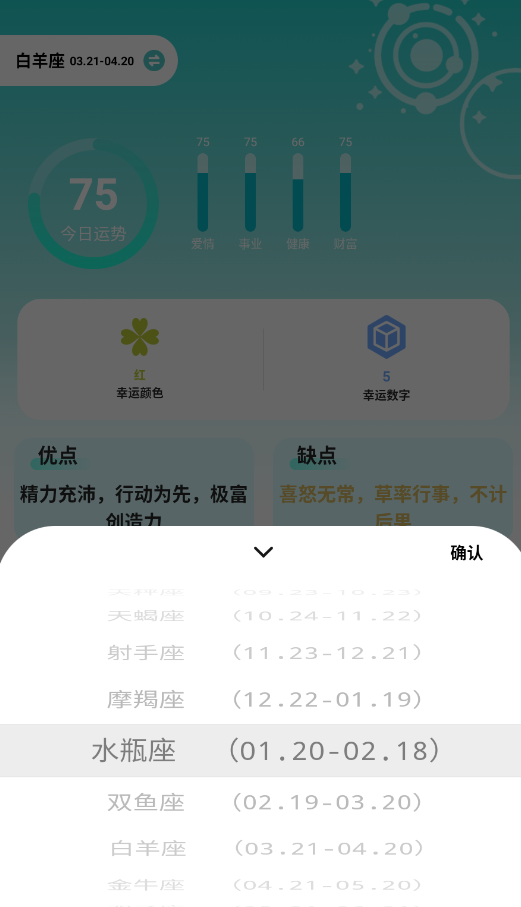 2、点击星座切换按钮,可自由选择查看其他11个星座的每日运程预测。