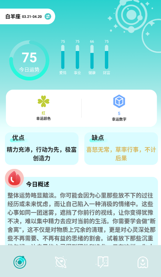 1、精准运势预测:采用国际权威占星算法,为12星座提供日、周、月三个维度的运势分析,包含情感、财富、健康等核心领域预测内容。