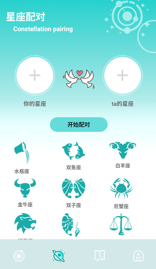 3、进入"星座配对"功能,输入双方星座即可获取情感契合度分析和相处建议。