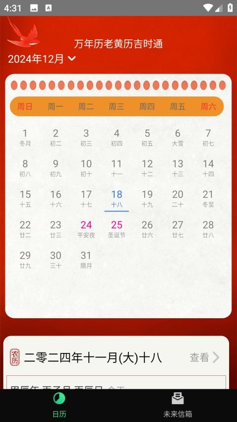 老黄历吉时通为用户提供全面的日历查询服务,涵盖农历公历转换、黄历宜忌查询以及节日节气提醒等功能,帮助合理规划日程。其特色未来信箱功能支持撰写时光信件,实现与未来自我的跨时空对话。该应用整合传统历法与现代需求,既满足日常查日期需求。