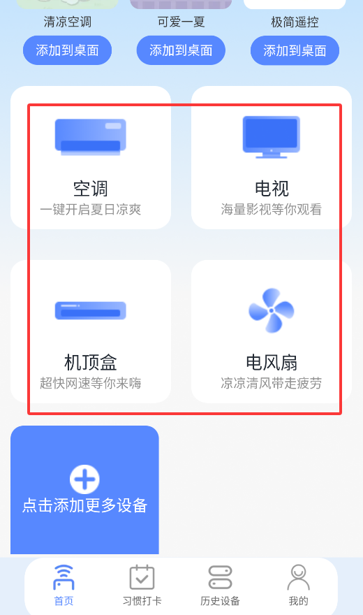 1、快速添加设备:点击"+"扫描家电二维码或选择品牌型号,测试基本功能后完成绑定。