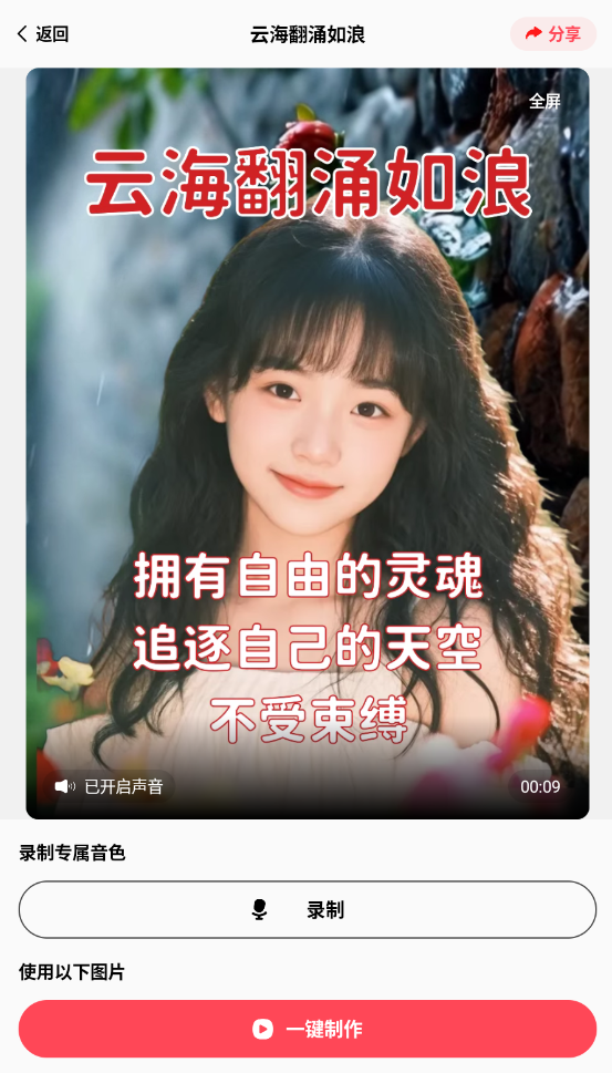 2、点击"一键制作"快速生成模板视频,或选择"录制"功能进行个性化创作。