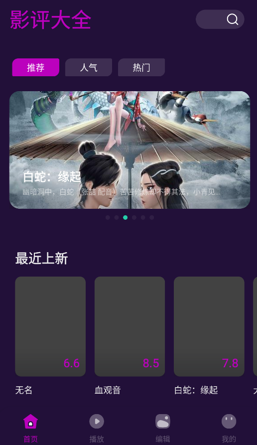 1、打开应用后,在首页浏览"影评大全"专栏,系统会智能推荐热门影视、高分作品和人气榜单。