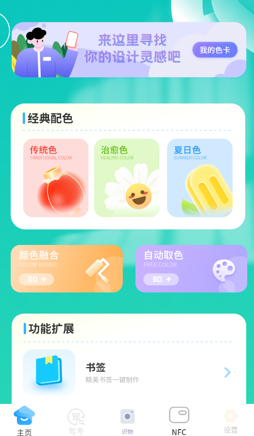 1、打开APP后,首页提供智能配色功能,包含经典色卡推荐、色彩融合及照片取色等实用工具。
